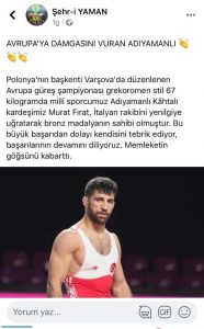 Ancak Adıyaman’da ‘Şehr-i Yaman’ isimli bir sosyal medya hesabından yapılan paylaşımda, Murat Fırat’ın Adıyaman Kâhtalı olarak yazılması Şanlıurfa’da tepkilere neden oldu. Paylaşımda, “Milli Sporcumuz Murat Fırat, İtalyan rakibini yenilgiye uğratarak bronz madalyanın sahibi olmuştur. Bu büyük başarıdan dolayı kendisini tebrik ediyor, başarılarının devamını diliyoruz. Memleketin göğsünü kabarttı” ifadelerine yer verildi.