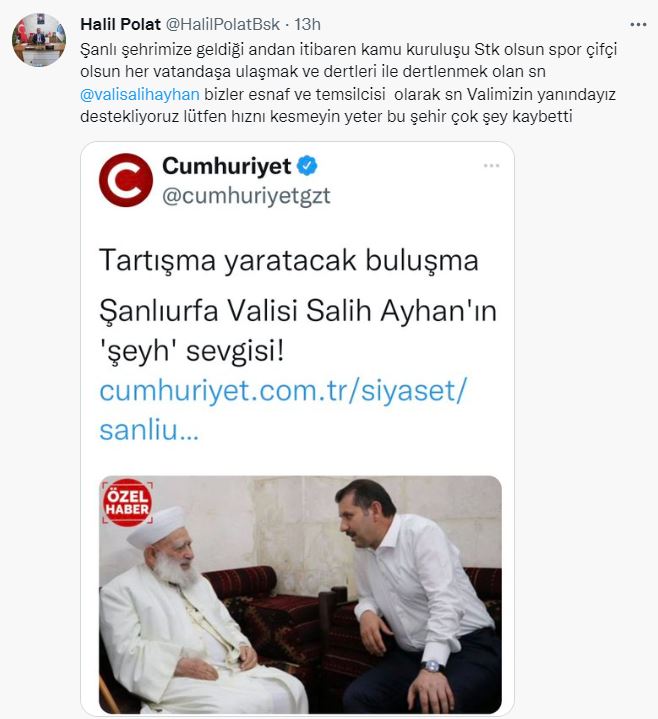 Zirai Aletler ve Motorlu Vasıtalar Tamircileri Sanat ve Esnaf Odası Başkanı Halil Polat, sosyal medya hesabı üzerinden Cumhuriyet Gazetesinin “Tartışma Yaratacak Buluşma Şanlıurfa Valisi Salih Ayhan’ın Şeyh Sevgisi” başlıklı haberini alıntılayarak net bir dille Vali Ayhan’a destek verdi.